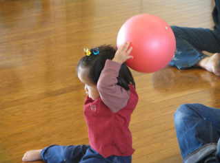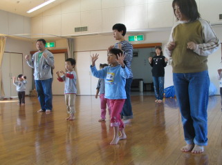 | 名古屋YMCA講師上田真理子先生の指導で、親子の スキンシップとコミニュケーションをとりながら楽しく運動しました。 |