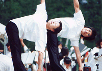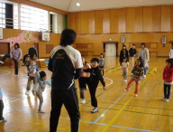 | 18組40名参加 Big−Sフイットネスの木野村由美子先生の指導で、 フラフープを使って輪くぐりや、 三角コーンを使って ジグザグ走りなど 親子で楽しくスキンシップしました。 |