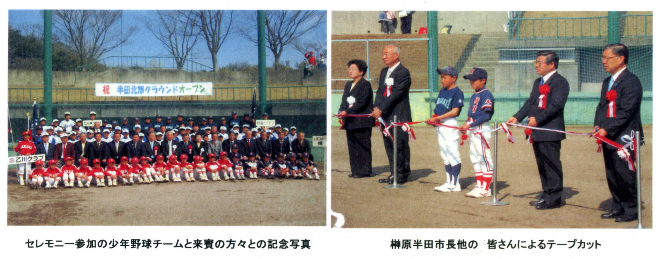 | 野球、サッカー、テニス、陸上競技ができる半田市北部グラウンドが 4月10日にオープンしました。オープニングセレモーニーには 榊原半田市長をはじめ多くの関係者のかたが出席され 乙川SCからも関会長・近藤理事長が出席しました。 今後、多くの方の活用が期待されます。 |
